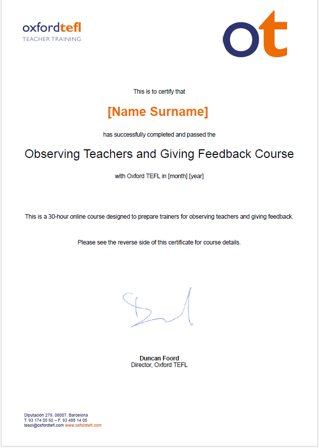At the end of the course we will provide you with an Oxford TEFL digital certificate which states that you have completed and passed the course.